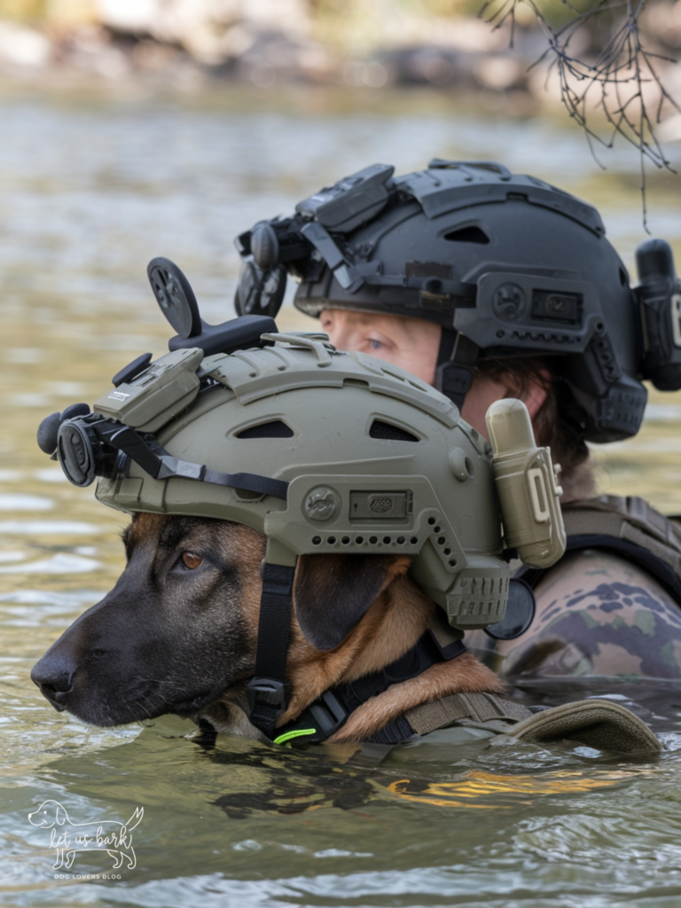 This captivating image showcases a remarkable bond between a highly trained working dog and its handler, both equipped with tactical gear. The scene unfolds in a watery environment, possibly during a search-and-rescue mission, military operation, or a specialized training exercise involving water navigation.